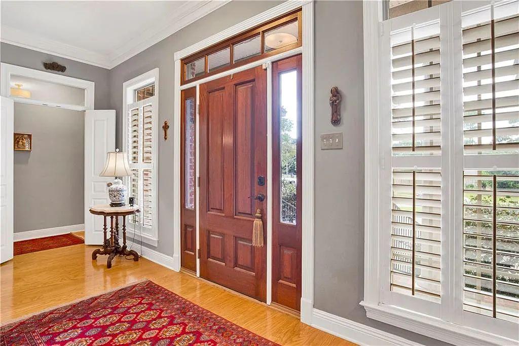 Stepping through the grand double doors, you're greeted by an architectural masterpiece that will leave you in awe. The soaring ceilings are adorned with custom-milled wood trusses, arched to create a sense of refined grandeur. Right away you will notice the attention to every detail from the solid teak floors, plantation shutters throughout the home, extensive custom trim work, beautiful lighting, coffered ceilings in the dining room and Cypress walls in the office.