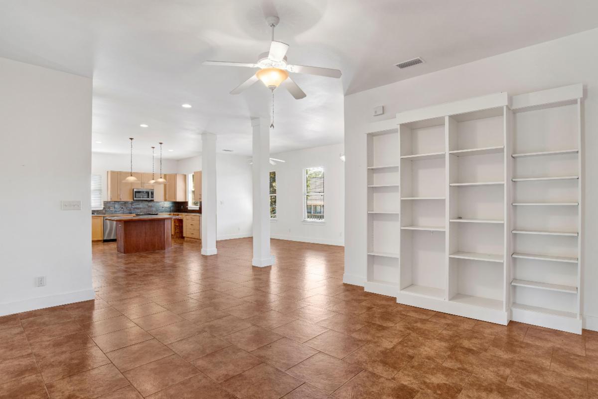 Big kitchen with island & breakfast bar. Plenty of cabinets and tile back splash. Living room has double sided gas fireplace & built in shelving units, with direct access to covered patio & fenced backyard. Graciously sized primary bedroom with tall double sink vanity, tiled shower and two walk-in closets.