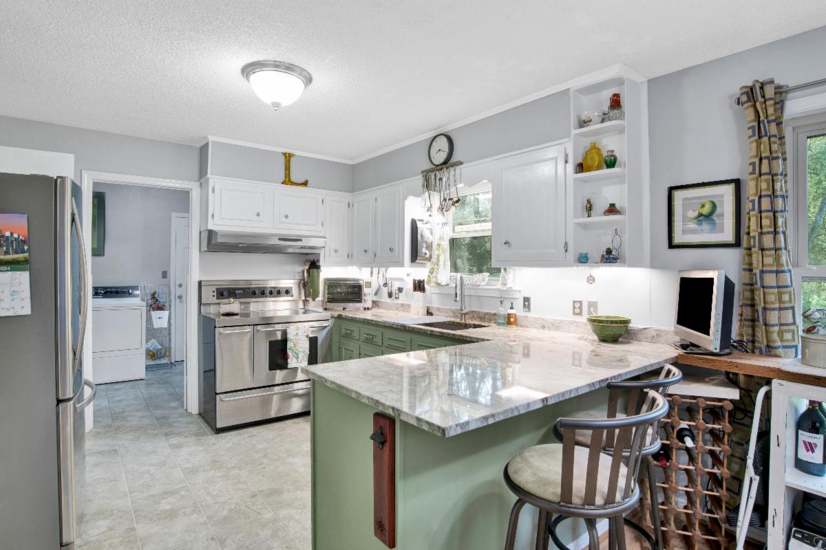 Featuring a large living area with cathedral ceilings and abundant natural light. NEW Paint inside and out and all new LVP flooring NO CARPET. The open floor plan flows seamlessly into the completely UPDATED KITCHEN with beautiful counter tops, light painted cabinets, and new appliances and new tile floors, plus charming bay window with a built-in window seat.