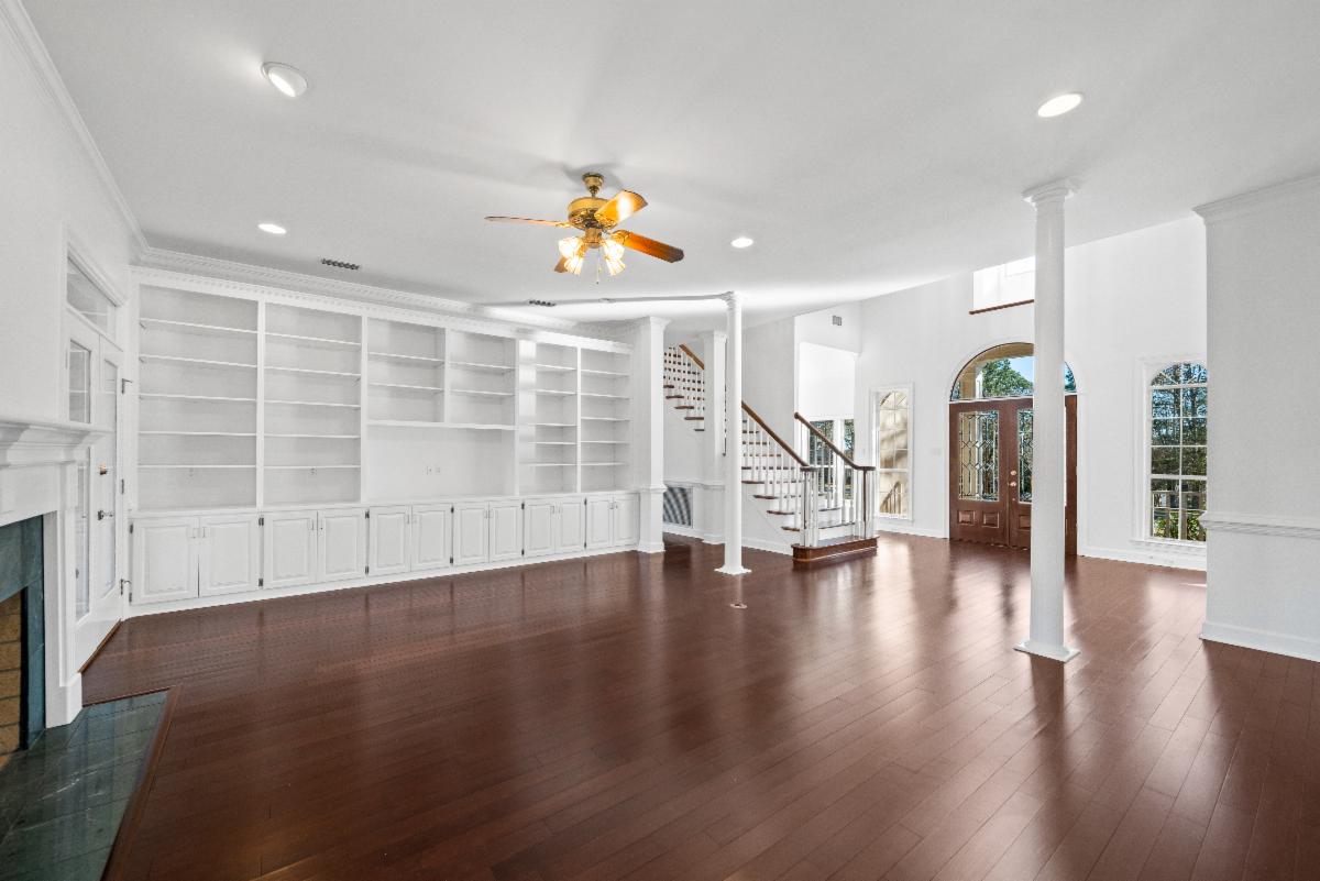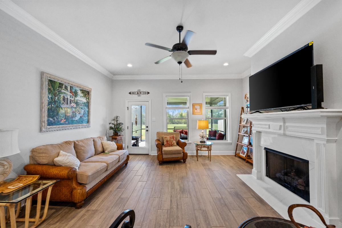 Inside, the home features NO CARPET and PLANTATION SHUTTERS, spacious layout with 4 bedrooms and 3 full bathrooms, along with soaring ceilings in the foyer, dining area, and main living space that create an open and inviting feel. The living room showcases hardwood flooring, a classic gas fireplace with custom built-in shelving, and large windows that fill the space with natural light while framing views of the pool.