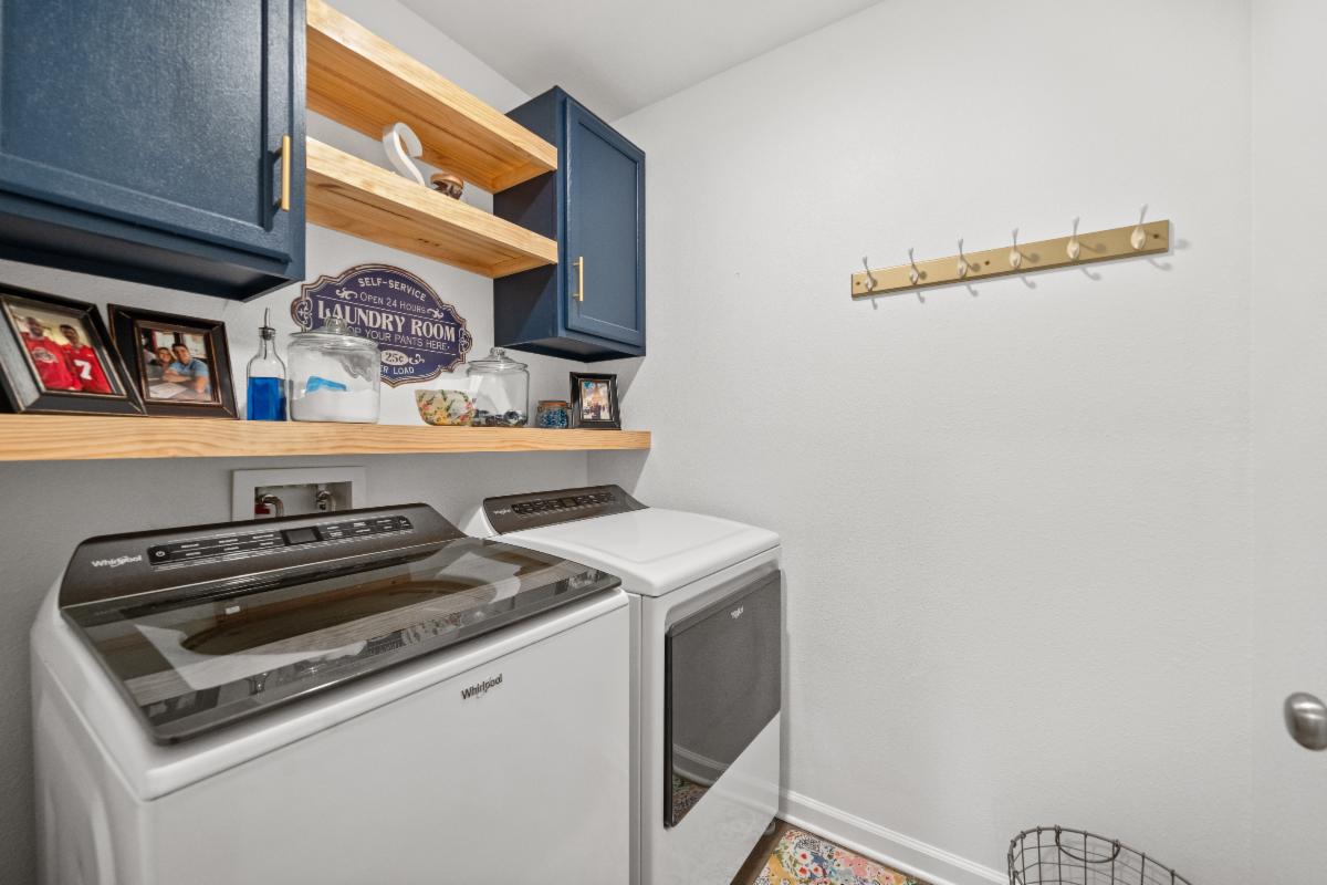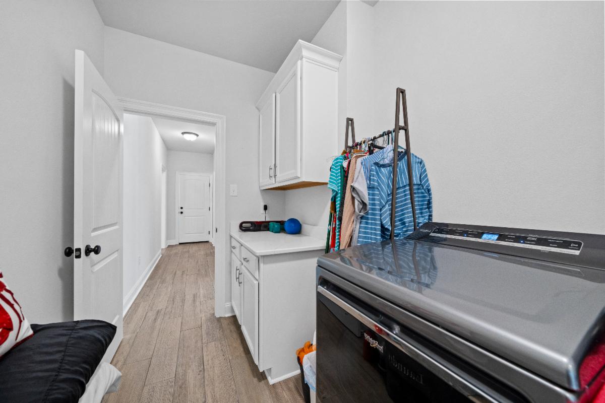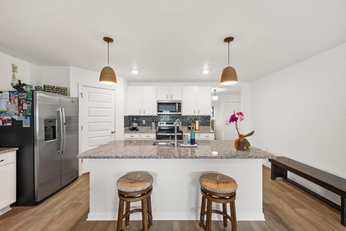 Inside, you'll love the durable wood-look porcelain tile flooring throughout the main living areas, paired with upgraded cabinetry, quartz countertops, LED lighting, and stylish finishes. Beautiful kitchen features a white cabinets, LARGE ISLAND, walk-in pantry, stainless Frigidaire appliance package with gas range, and the refrigerator, washer, and dryer all remain, making this home truly move-in ready.