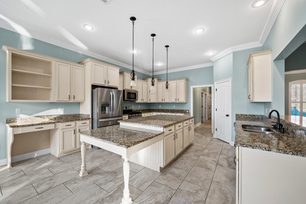The kitchen has a large granite double island, stainless steel appliances including a gas range, refrigerater, abundant cabinetry, under-cabinet lighting, and a versatile flex space that works perfectly as a coffee bar, prep station, or workspace. The primary suite provides a relaxing retreat with a spacious layout featuring, custom tiled walk-in shower, double vanity, and a generous walk-in closet.